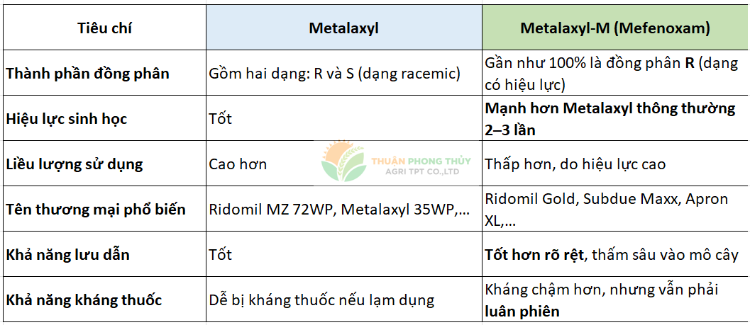 Rất nhiều người nhầm lẫn giữa Metalaxyl và Metalaxyl-M, nhưng thực tế chúng khác nhau về cấu trúc phân tử và hiệu lực, dù cùng thuộc nhóm hoạt chất trừ nấm phenylamide, chuyên trị nấm Phytophthora, Pythium và một số nấm "chân giả" (oomycetes).