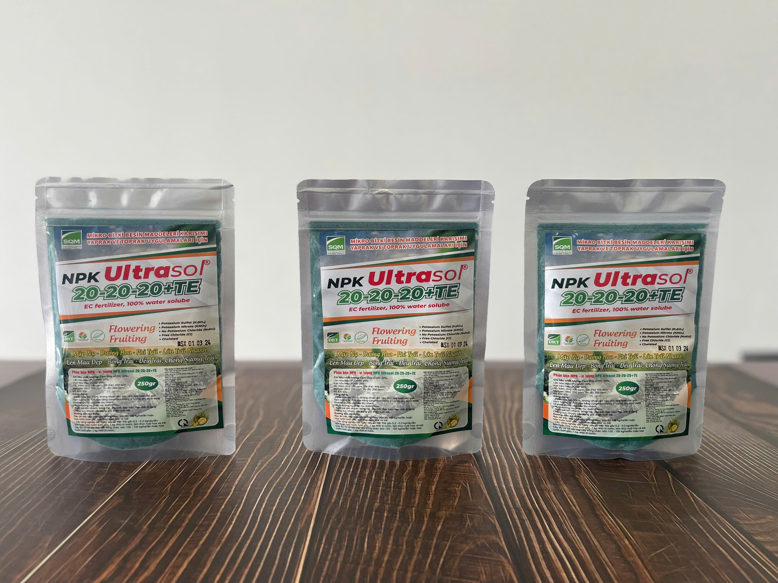 PHÂN BÓN LÁ NPK 20-20-20+TE giúp tăng khả năng quang hợp, cây sinh trưởng mạnh, tăng sinh khối, ra hoa sớm, hoa trổ đều, trái mau lớn, tăng màu sắc và hương vị, năng suất cao, chất lượng ngon.